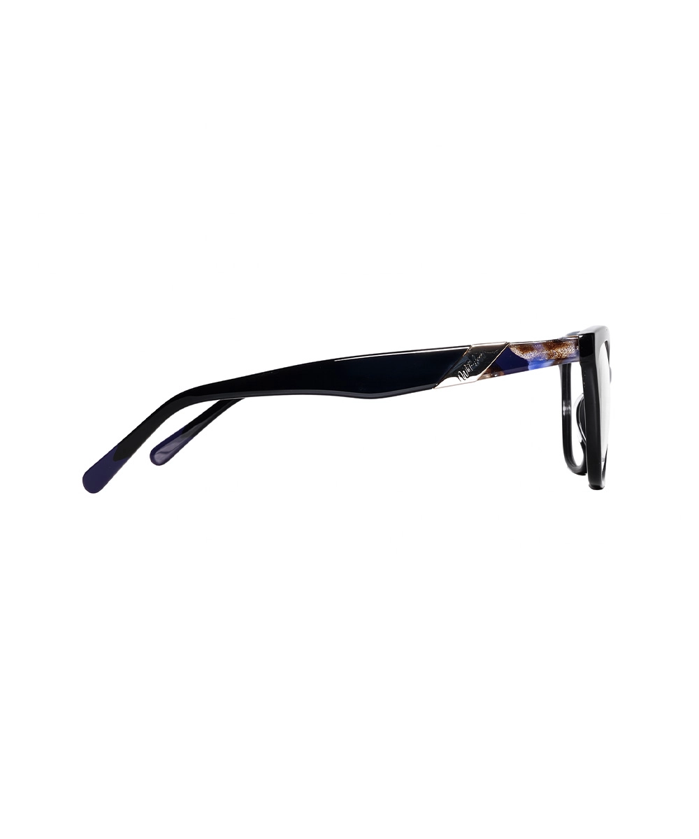 Featuring a classic cat-eye silhouette and a polished black finish, this optical frame is a symbol of feminine intelligence and elegance that adds depth and charm to your face. The unique feature of this model is its beautifully sculpted temples, adorned with a navy and azure watercolor pattern and branded with a gold metal accent for a luxurious touch. The frame is crafted from premium-grade handmade cellulose acetate, which offers high impact resistance while remaining remarkably lightweight, making it ideal for long-term daily wear. Reinforced metal hinges and an ergonomic design provide outstanding stability on the face, ensuring a pressure-free and fatigue-free experience for the user.